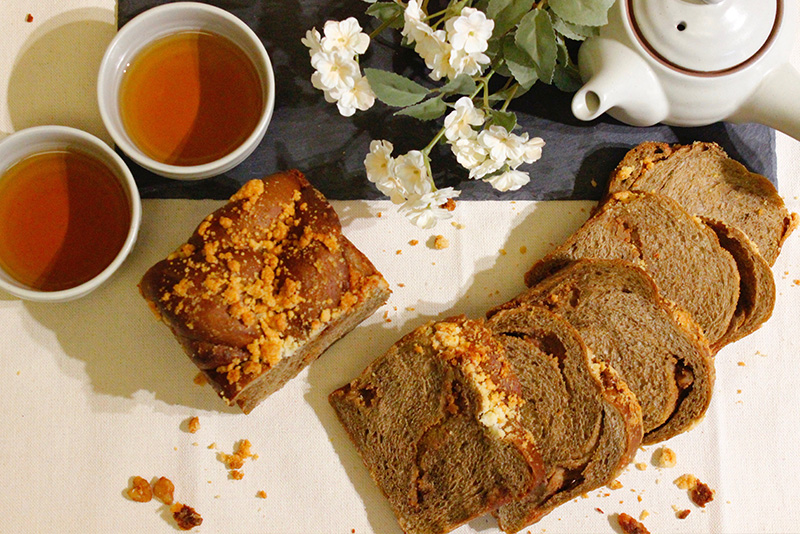 ほうじ茶の香ばしさがふわりと広がる生地に、やさしい甘さの自家製きなこクリームとくるみを包み、サクサクの手作りクランブルを乗せて焼き上げました。和の風味を楽しめるパンです。